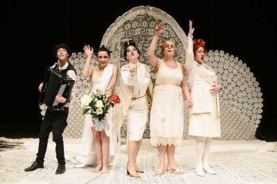 In scena solo la signora Page, la signora Ford, la giovane Anne Page e la serva Quickly, che danno parola anche ai personaggi maschili, assenti ma molto presenti: mariti, amanti, e, soprattutto, il più grande: Falstaff, da cui tutto comincia e con cui tutto finisce. Le lettere d’amore che il Cavaliere invia identiche alle signore Page e Ford sono lo stimolo per trasformare il solito noioso - e very british - pomeriggio di tè in uno scatenato gioco dell’immaginazione, del desiderio, del divertimento. Punire Falstaff, che osa far loro esplicite richieste d’amore, diventa il grimaldello per sentirsi ancora vive, e senza di lui non ci sarebbe divertimento o sfogo per le signore Page e Ford, che, come le Desperate Housewives della celebre serie tv, sono donne di mezza età, borghesi, annoiate e un pizzico bigotte, con routine consolidate, mariti assenti e desideri sopiti. «Per la sua ostentata dissolutezza in Falstaff si possono scorgere dei tratti di Don Giovanni e respirare aria buona di libertà; nella sua evidente “decadenza” si rispecchia quanto di più umano e disarmato si possa concepire», racconta Sinigaglia, che ha voluto in scena anche una fisarmonicista che, oltre a suonare dal vivo le note di Verdi, interpreta Fenton, il grande amore di Anne, «un ruolo “en travesti” – prosegue – come vuole la tradizione shakespeariana (ma al contrario!)».